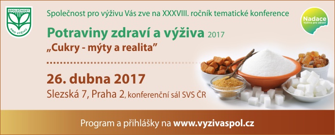 Ve středu 26. dubna 2017 se koná v konferenčním sále SVS ČR, Slezská 100/7, Praha 2 XXXVIII. ročník konference Potraviny zdraví a výživa 2017 s podtitulem Cukry – mýty a realita. Akci pořádá Společnost pro výživu ve spolupráci s Nadací výživa pro zdraví pod záštitou Úřadu pro potraviny MZe ČR a České technologické platformy pro potraviny. Moderují MUDr. Petr Tláskal, CSc.; Ing. Jan Pivoňka, Ph.D.…