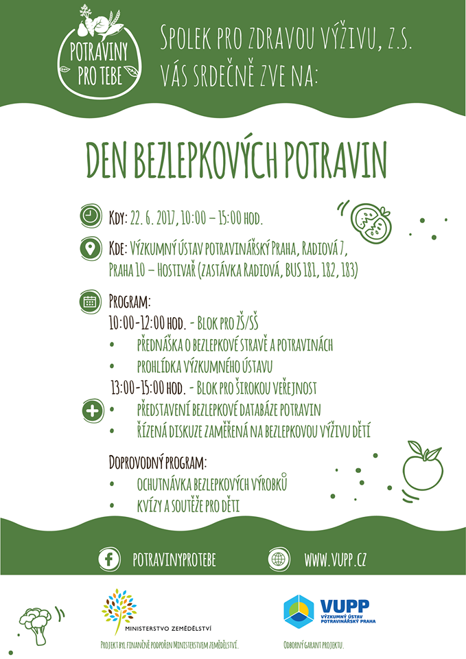 Spolek pro zdravou výživu, z.s. ve spolupráci s Výzkumným ústavem potravinářským Praha, v.v.i. Vás srdečně zve na DEN BEZLEPKOVÝCH POTRAVIN, který se koná ve čtvrtek 22.6.2017 od 10.00 do 15.00 hodin v areálu výzkumného ústavu v Praze 10 - Hostivaři (zastávka Radiová, BUS 181, 182, 183). Dopolední program je určen pro základní a střední školy, odpolední blok potom pro širokou…