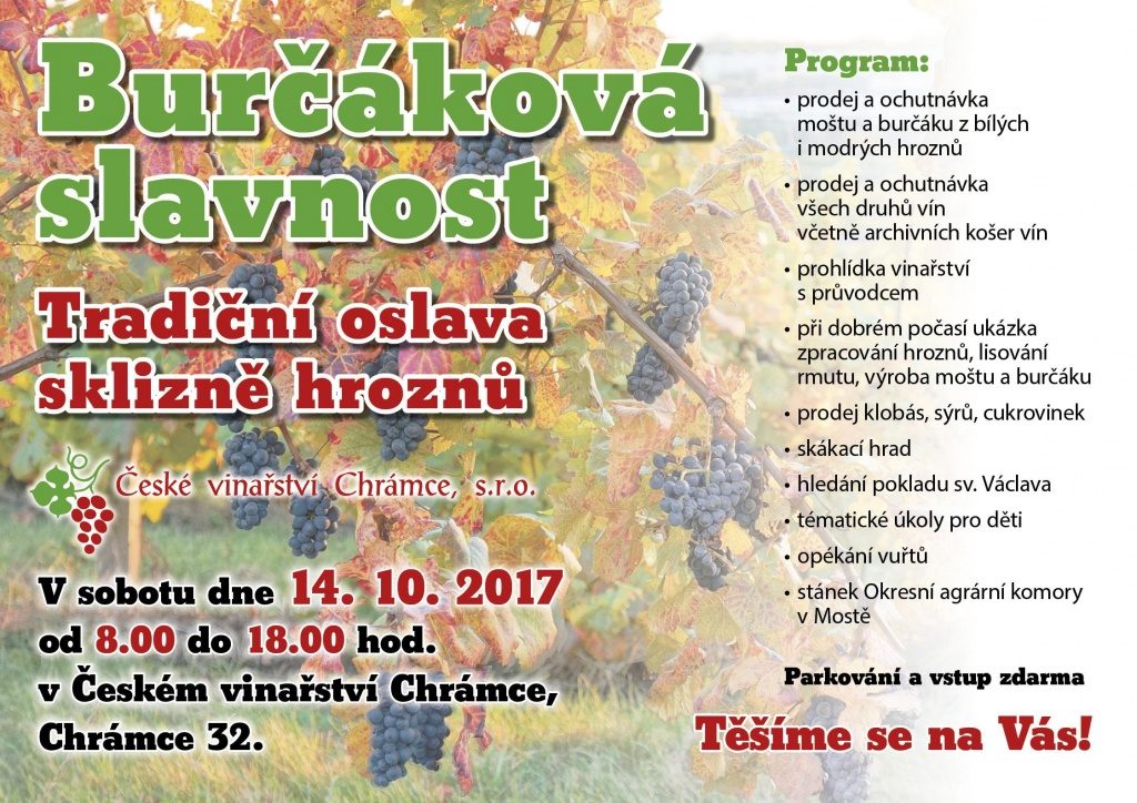 Dne 13. 5. 2017 od 8.00 do 18.00 hodin se koná DEN OTEVŘENÝCH DVEŘÍ ve vinařství v Chrámcích. Připomeneme si 50 let novodobé historie pěstování révy vinné na Mostecku. Všichni návštěvníci jsou srdečně zváni! http://www.ceske-vinarstvi.cz/ V objektu vinařství pořádá VÚPP ve středu 4.10.2017 exkurzi v rámci cyklu seminářů na téma nové technologie zpracování a skladování potravin. Bližší informace: http://vupp.carc.cz/domains/vupp.carc.cz/cs/cyklus-seminaru/#pozvanka